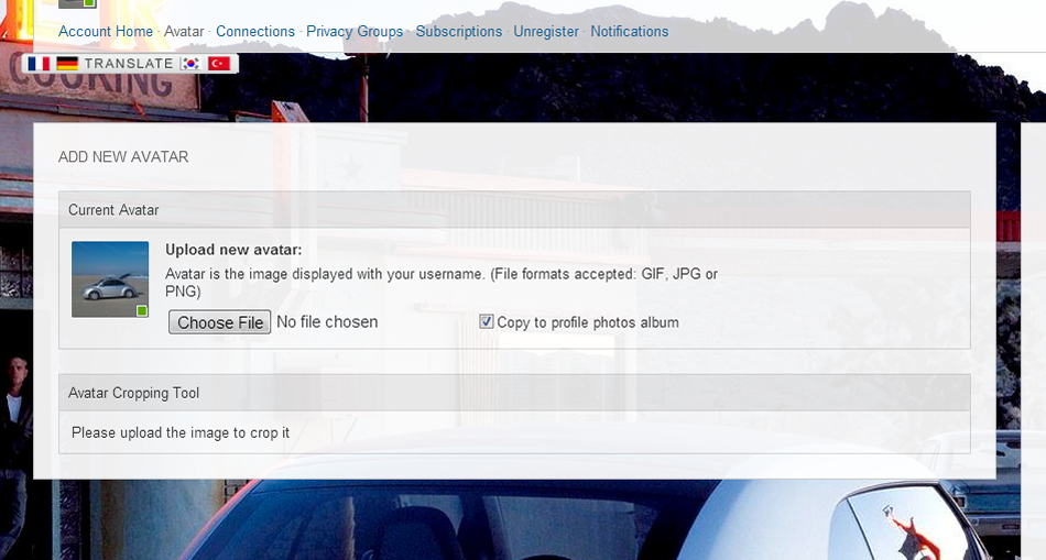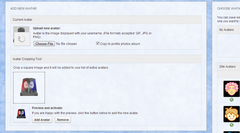 The avatar "page" is modified. The proceed, again, you select an image, it uploads and then activates the cropping tool, then you "Add Avatar"