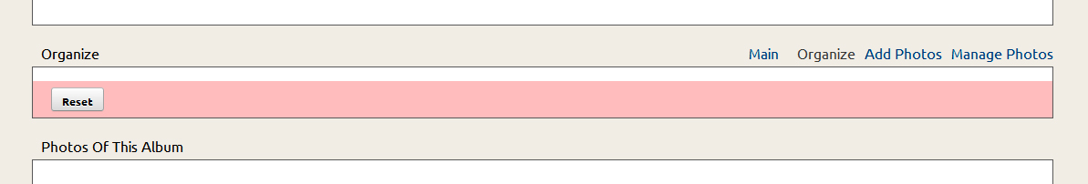 This is a fresh install of 7.1.4. When arranging photos with Organize, it rearranges the photos but if you do a reset, it resets the album but does not return the block with the photos. This is working on the demo site so it must be something with my server. No javascript or jquery except what ships with Dolphin is on the page. js cache and compression is turned off. Does it with the UNI template. See the screenshot.