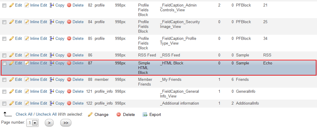 If it is there than delete it or if its not there than . daaaaaa....... Run this sql in phpmyadmin INSERT INTO `sys_page_compose` VALUES(87, '', '998px', 'Simple HTML Block', '_HTML Block', 0, 0, 'Sample', 'Echo', 1, 0, 'non,memb', 0, 0); and not to forget clear the cache. so much to do.... |