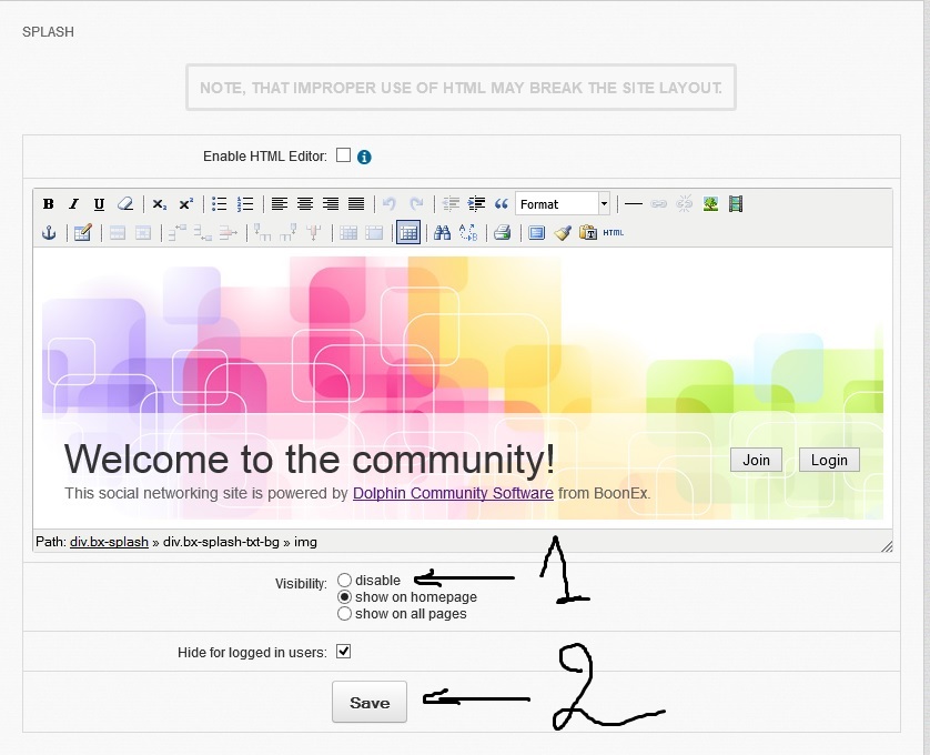 If you have tried to edit the promo box, the warning states, be careful..improper HTML will break few things.. I mess it up often unless I use something like Dreamweaver to get it all proper, then save.. No... i want only change texts Welcome to the community and translate buttons, but if i want save... then i get only message page was not found, like this screenshot here. |