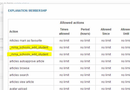 Hi, I see "_mma_schools_add_student" code in Membership "Allowed Actions" ... please see attached image... I tried to find it in language setting but couldn't find it... how can I replace it? Thanks |