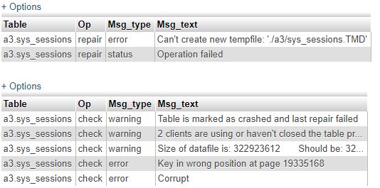i see error "#144 - Table './a3/sys_sessions' is marked as crashed and last (automatic?)" repair failed and cant do anything about it