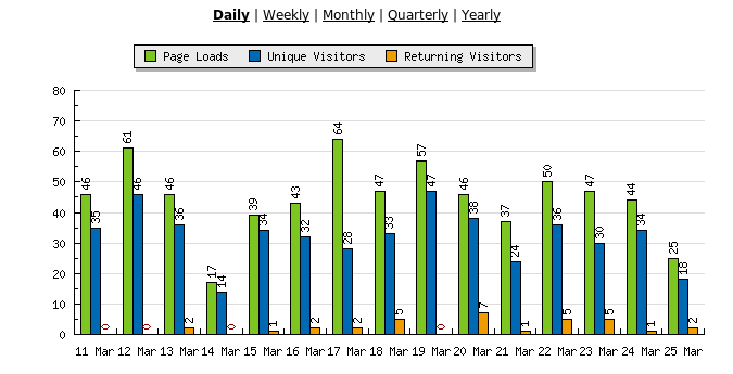 I think you should install Google Analytics for some more realistic values. It was a good idea though to reassure the OP about high numbers if his stats are counting things like every single message sent using the simple messenger as one hit. 1777 page views per user, on your site, per day is very unlikely. |