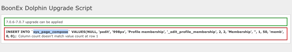 After upgrading, I got the BoonEx Dolphin Upgrade Script stating "7.0.6 - 7.0.7 upgrade can be applied" but I also got a message below that (see attached photo). Can anyone tell me what that means?