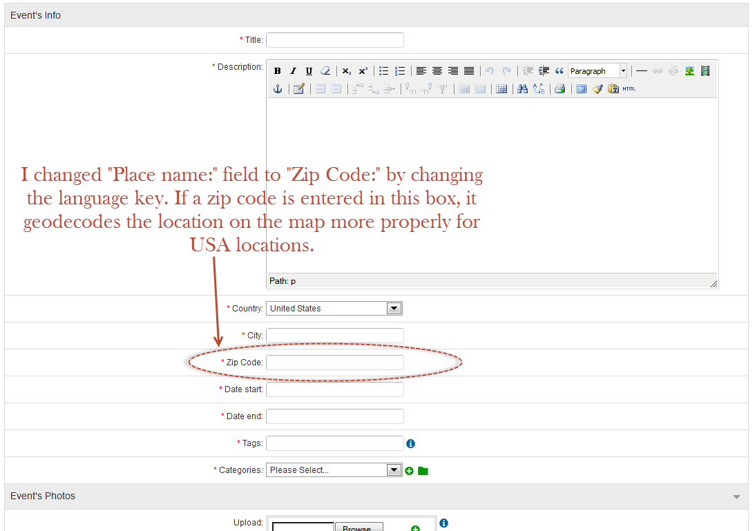 Edit the language key and change "Place name" to "Zip Code". Save and flush cache. Now add an event. You will notice there is a place to put in a zip code now. This will allow it to geodecode the location and show properly on the map. You will still need to make sure that the full address is shown in the text of the event so that the users will have the full street address. |