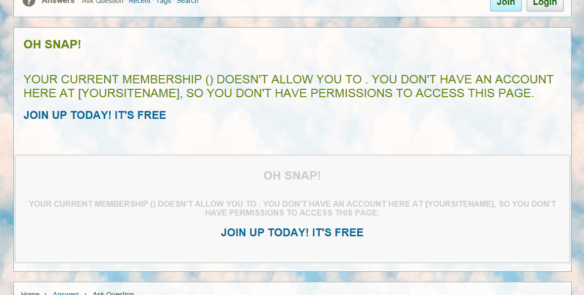 <h1>Oh SNAP!</h1><br><div style="width: 100%"> Your current membership (<b>{2}</b>) doesn't allow you to <b>{1}</b>. You don't have an account here at [YOURSITENAME], so you don't have permissions to access this page. <a href="http://www.YOURSITE.COM/join.php" target="_self"><br><h2>Join up today! It's FREE</h2></a></div><br>