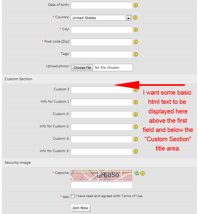 A screenshot is attached. All of the info you see is contained within the Join Now block, so adding an HTML block below the Join Now block would cause that HTML text (the instructions for the Custom Section) to be below the entire join form.
