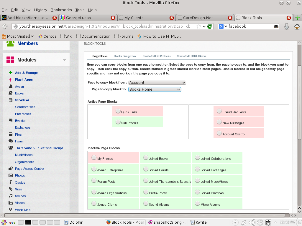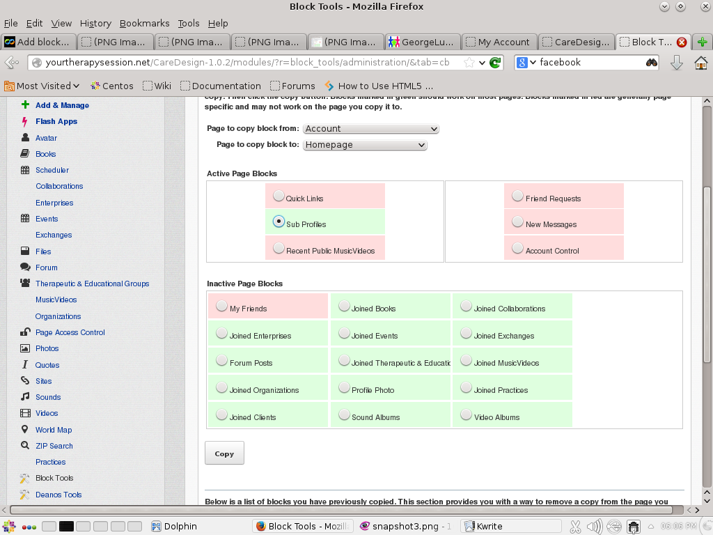 with Block Tools, you are able to copy blocks from one page to another. In your scenario, you want to copy the "Who Viewed This Member" that is on the account page to your site home page. In my screenshot - and using Block Tools - shows how that would be acccomplished. In my case, I do not have the same module, but have selected another one as an example. But as I said earlier - not all blocks are copyable. But if it is, and once you have copied a block, it will show in the page builders of the page you copied it to. caredesign.net |