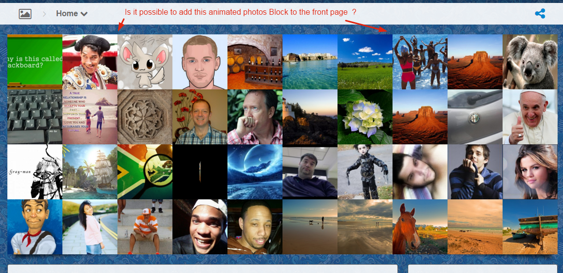 I'd like to add the animated photos-cover on front page (please see attached) - I was able to locate the Block { _bx_photos_cover } and wanted to create a new Photos Cover Block on front page and copy { _bx_photos_cover } to front page..