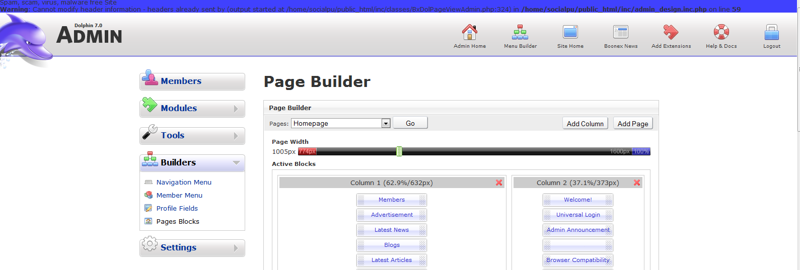 Warning: Cannot modify header information - headers already sent by (output started at /home/socialpu/public_html/inc/classes/BxDolPageViewAdmin.php:324) in /home/socialpu/public_html/inc/admin_design.inc.php on line 59