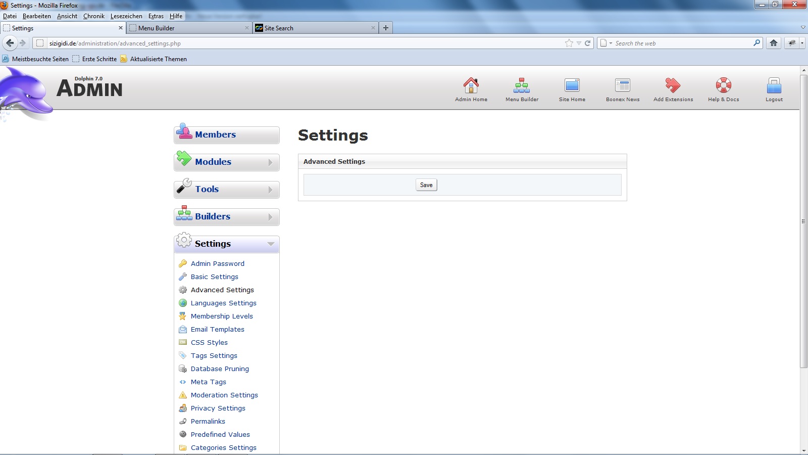 Have you ever noticed the Advanced settings working? If not, if someone installed Dolphin for you ask them to double check that all files were uploaded to your server. If you control the server then I suggest you install another Dolphin site and check it for the same error. Alternatively, if you can afford it, buy another hosting package and install another site and check for the same error. If no error found then compare the files in one site to the other... if no difference then the problem is most likely in the first database (and I don't know how to compare databases). If all else fails you may need to reinstall it and start over. In which case, back everything up and take detailed notes on all your work thus far. There are a lot of components (scripts, functions, etc) in a Dolphin site. The first Dolphin site I setup got so messed up from all the feature testing I'd done, while learning what could and should not be done, that I had to start over from scratch. http://pkforum.dolphinhelp.com |