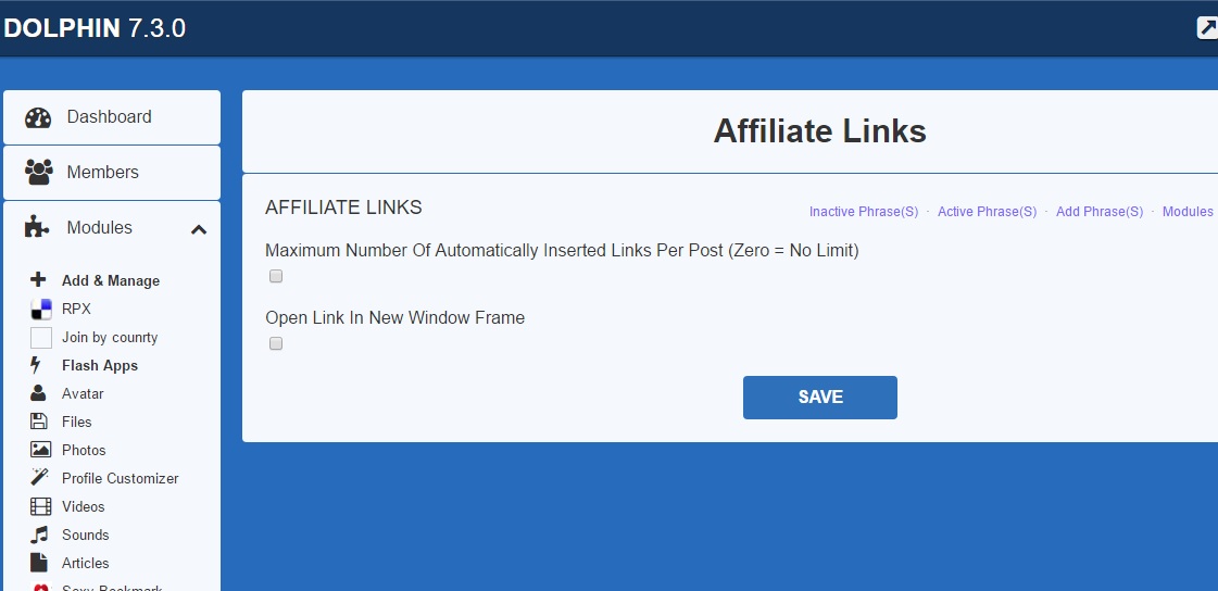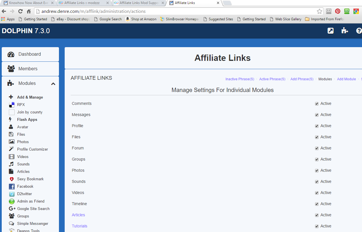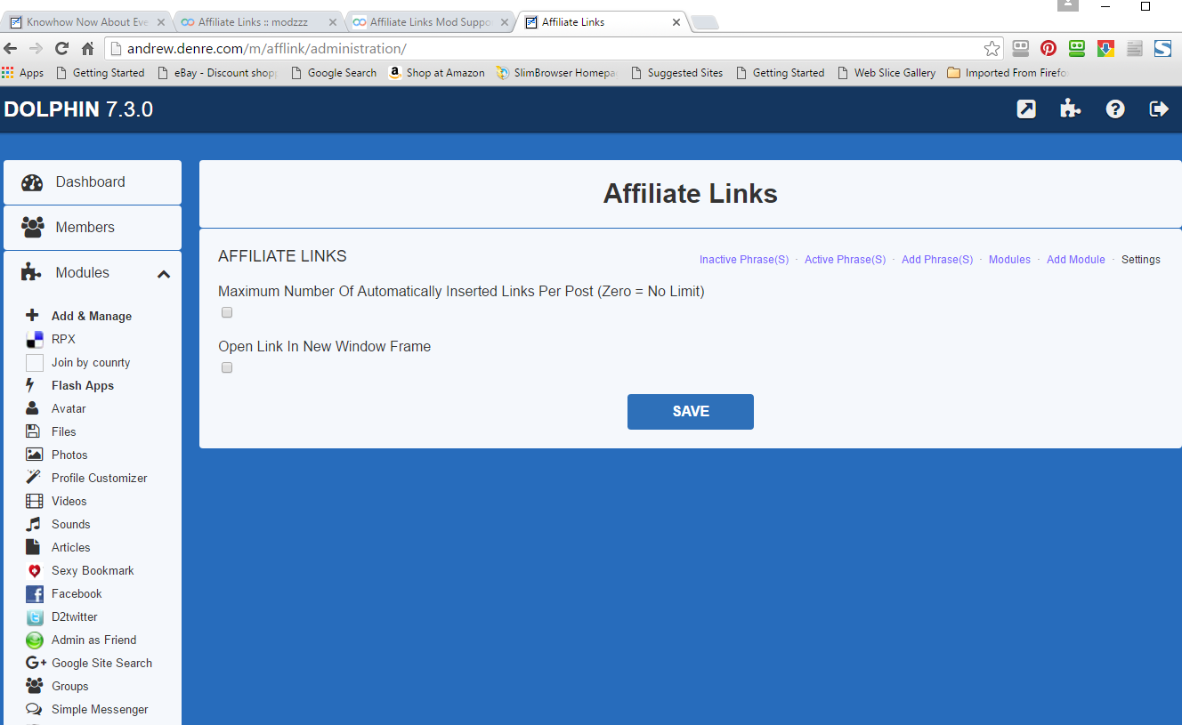 @dustybin If you re-installed the module, you will see a textbox instead of a checkbox for option that says "Maximum number of automatically inserted links per post ". I have just re-downloaded the mod and reinstall on a test site to confirm that this change is working. Based on your example, you are posting in my Ultimate Articles module. By default this module is not integrated. Did you go to the "Add Module" Tab and integrate this module with Affiliate Links? Paypal email is jeromemingo@gmail.com - http://www.boonex.com/market/posts/modzzz |