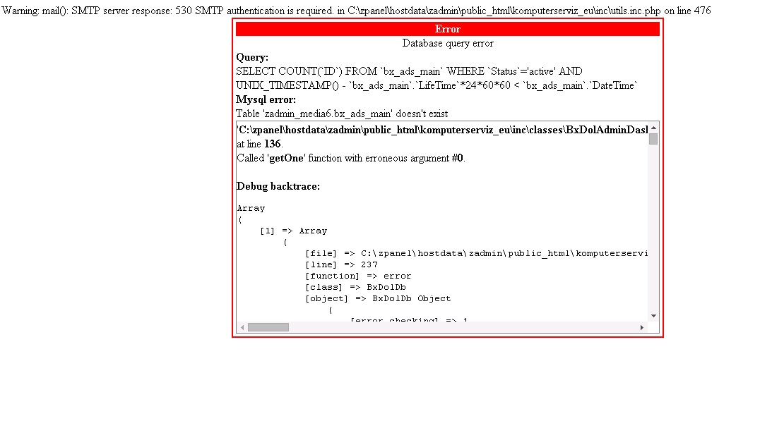 Warning: mail(): SMTP server response: 530 SMTP authentication is required. in C:\zpanel\hostdata\zadmin\public_html\komputerserviz_eu\inc\utils.inc.php on line 476 |
