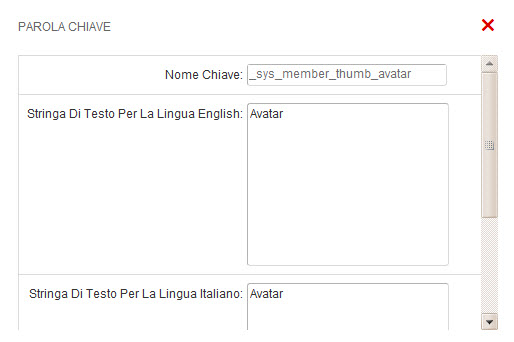 Alcuni termini non appaiono anche cambiando la chiave manualmente. Per esempio nella chiave _sys_member_thumb_avatar pur traducendo nella stringa di testo italiano Avatar mi rimane la stringa intera. Vedi allegati.