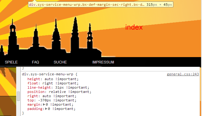 Hi. First, it is a great template!!!! Thanks for sharing it for free! I want the service-menu put to the top of the page. Everything works fine but not on the index-page ...... How can I show the service-menu on every page on the top on the same position? My changes on css you can see on the images. Rappi Bezirzer.de, elbrocker.de, tierschutz-community.de |