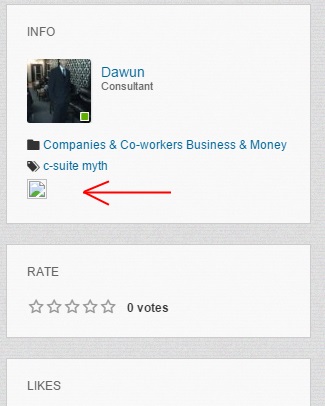Hello I'm not sure what you are seeing. Please look at the link again. Inside the box labeled "Info", the broken pic icon is just under the words "c-suite myth". I am attaching a screenshot. Sorry, I didn't notice the issue at first sight. This broken image is a country flag which should be displayed in the third row with the other location data. By default Country is a dropdown field without possibility to select nothing. In this case you should have some country selected and therefore its flag should be displayed in Info block. May be you did some customization in the module which relates to Country and the other location data. Best Regards AntonLV - http://www.boonex.com/market/posts/AntonLV |