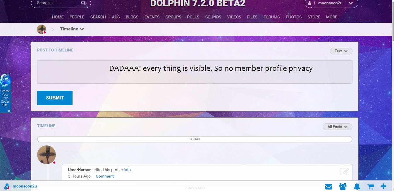 There is no profile privacy in dolphin right now. User content can easily be found even if they put the profile privacy to "Only Me". Same is the case with timeline privacy. purpose of reporting this bug is not to dis-heart dolphin members and admin team but is to make dolphin a stronger social networking script. And this bug is critical.