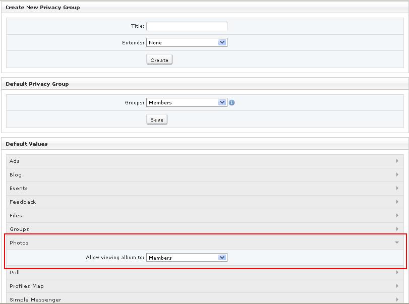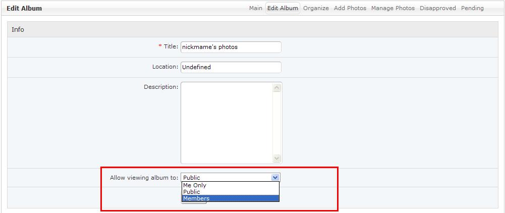 now from admin, go to site home to your profile icon, click on photos, then on Add Album, you will see "Allow viewing album to: Members" as being default.