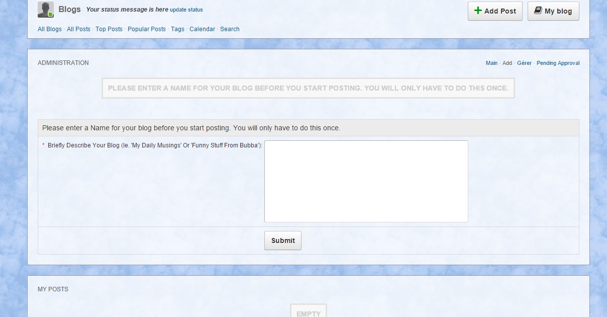 Please enter a Name for your blog before you start posting. You will only have to do this once.