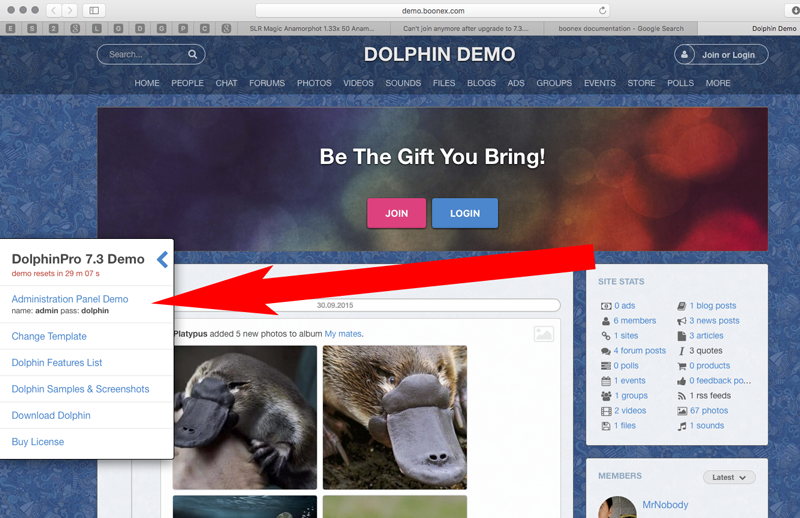 login to the site http://demo.boonex.com ---- the admin password can be found at the left side-