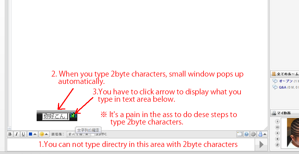 When you try to type with 2byte characters small window pops up and you have click arrow for each word not text. so it is pain in the a** to chat with 2byte characters. I mean it is useless.
