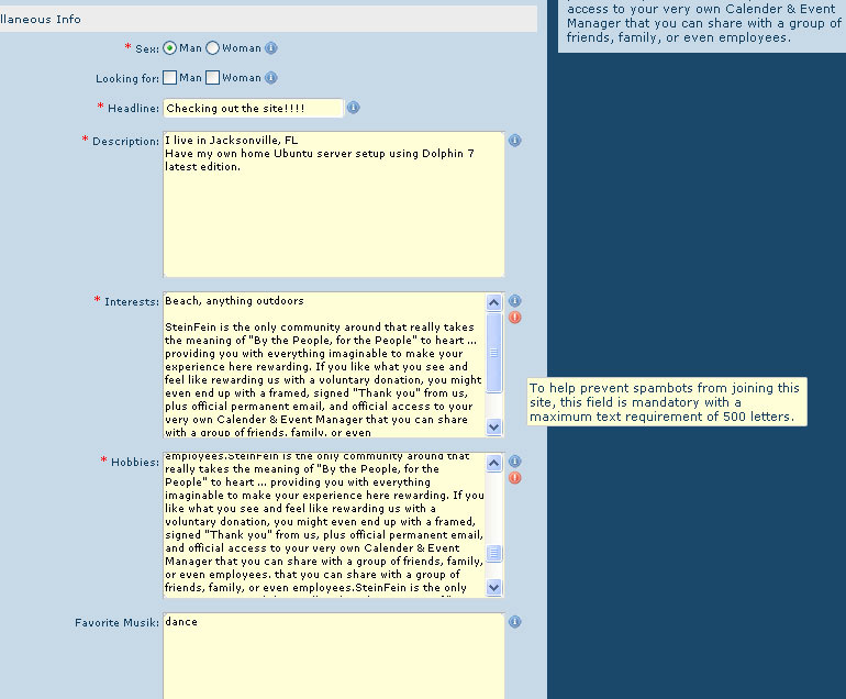 Okay, I received the confirmation email and I can see a new member added on the homepage. Coincidentally our Hobbies/Interest settings didn't deter spammers either since they ended up doing exactly what you did by copying and pasting blocks of text from somewhere else into those fields. That's why we ended up implementing the server wide IP blocking anti-spam features. Coincidentally, I'm in Florida too, closer to Melbourne though.