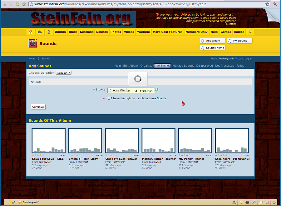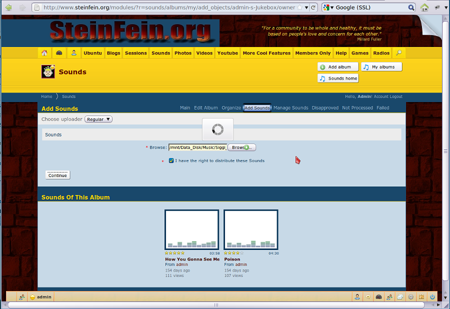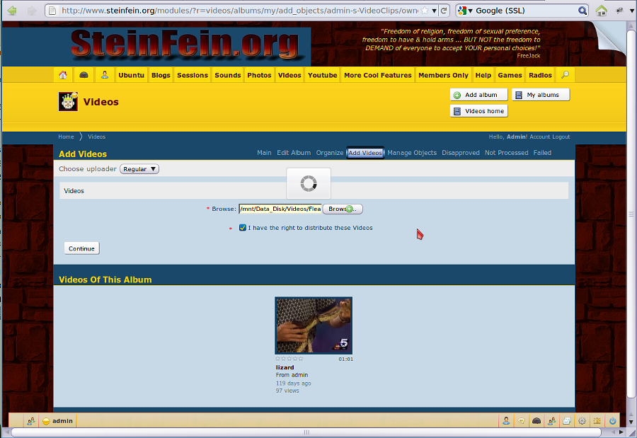 Finally, one more screenshot shows the busy symbol for uploading files. Regardless if flash or regular uploader, both of them seem to work, but then no file shows up anywhere. Heck, with google Chrome you can even see the file upload progress going from 0% to 100% in the lower left corner ... but nothing ever shows up.