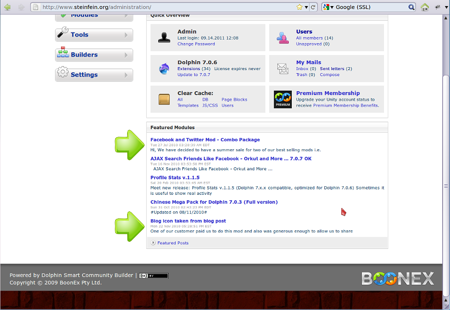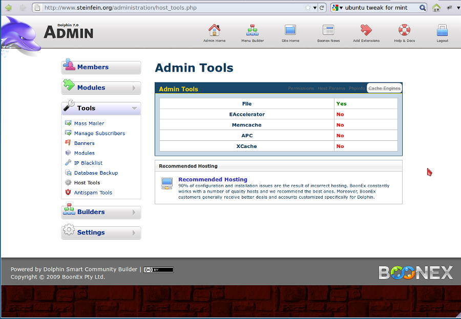 Hi everyone. Earlier this month we switched from a reseller account with cpanel access to our own vserver. Before making the switch we made sure that everything was up to par for Dolphin ... double, triple, and quadruple checked everything. The vserver is part of a quad core 64 bit system and we have 2 GB of ram dedicated to us, up to 8 GB burstable. We have a dedicated IP number and several domains that we have are all running with that IP. We can treat this vserver just like a regular server and it has Debian 6.01 Squeeze installed on it. When the transfer was completed, apparently the system admin was having some issues with SQL databases. Our Dolphin 7 community, currently at 7.06 is located at: www.steinfein.org