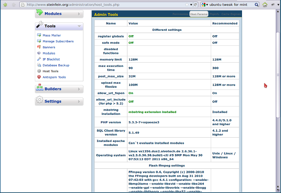 Admin panel ... tools ... hosting tools ... Shows upload_max_filesize of 2 MB even though the physical php.ini file for the domain has the recommended setting by boonex. Same applies to post_max_size which shows 8 MB in the admin hosting tools even though the physical php.ini is set to 128 MB as recommended.