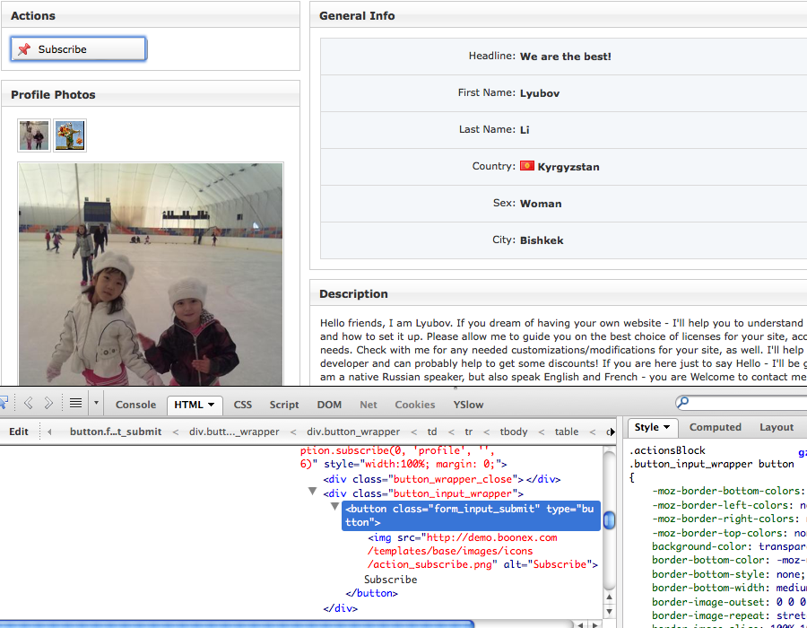 If all else fails and you can't find what you are looking for, download a copy of dolphin and unzip it. You can then use your computer's search features to find it. For example if I'm looking for the subscribe action button on profiles (see attached images), I click inspect element with Firebug and click the expand arrow/triangle icon to find the exact location of the image. If you only need the element then you're done. If you want to edit something else, search for the bit of code that points to it. Say I want to find what php file controls the Subscribe Action itself and I see "oBxDolSubscription.subscribe(0, 'profile', '', 6)" in the code listed by firebug - I simply search in finder for oBxDolSubscription within my Dolphin folder. That pulls up all files that contain the code I'm searching for, in this case it pulls up only one file BxDolSubscription.php. Tada!