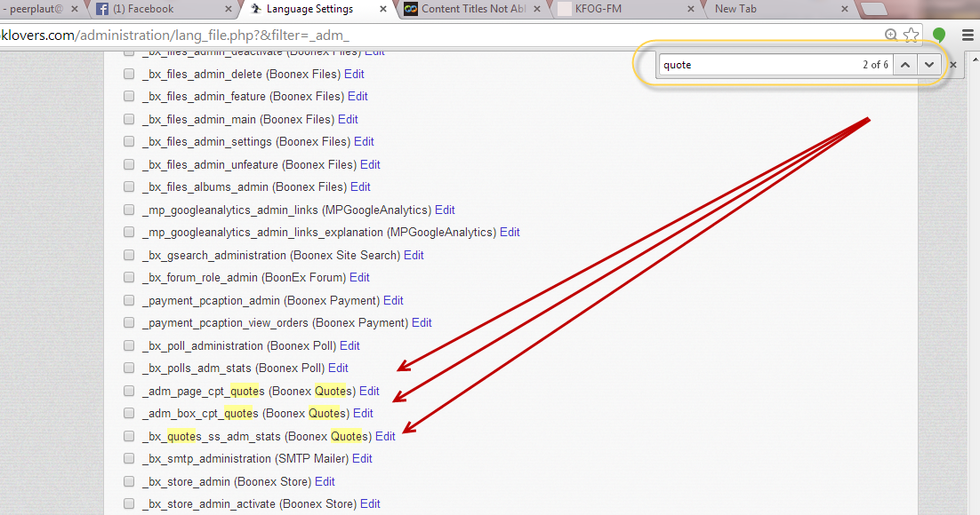 Guys- Thanks for your help. These items do Not Appear to be here. To replicate From the language settings search for _adm_ Then Ctrl F on your browser. Search for quote. There are three lines highlighted. None of these three lines changes the titles under the Content Section of the Admin Panel. Look at the screen shot.. BTW, I have checked for others, polls, members, etc. Peer L. Plaut Executive Director, Single Booklovers Connecting Bookworms Since 1970 |