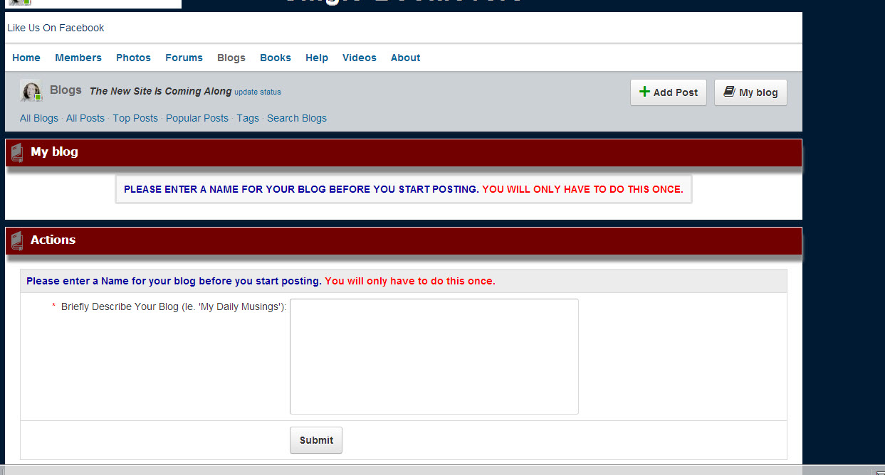 Please Enter A Name for your Blog Before you Start posting shows up in the "My Blog" Section as well as the "Actions" Setting.