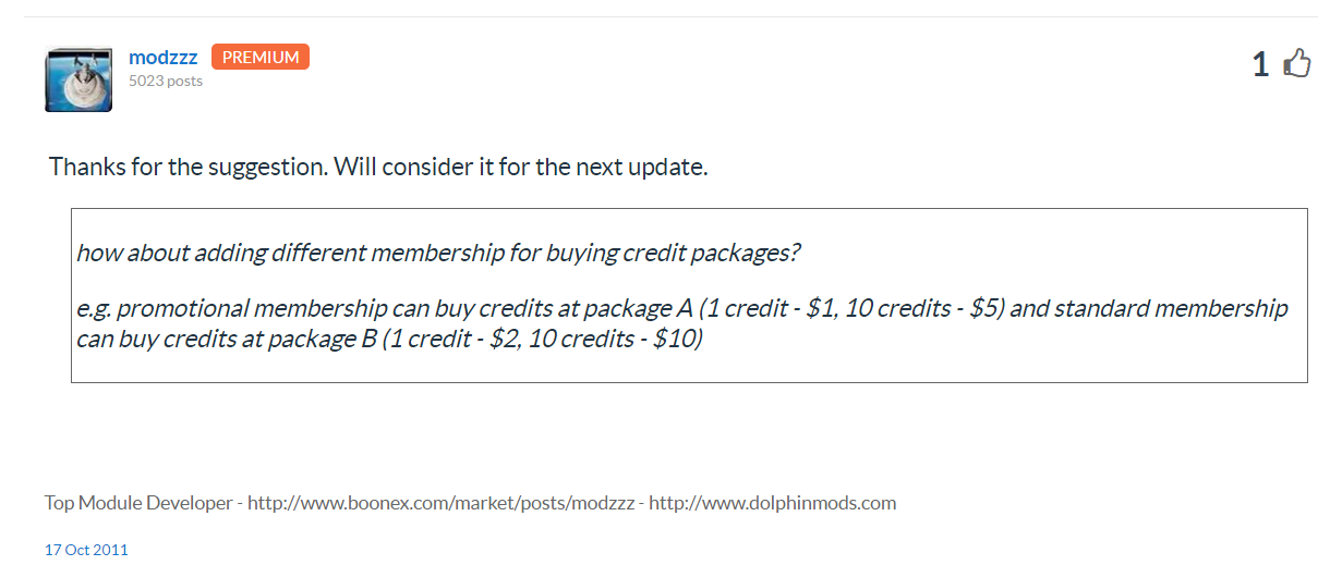 About adding different discount level according to membership lever for buying credit package. 17 Oct. 2011,you said you will consider about it.