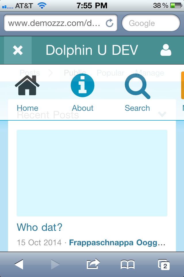 Alex, Here's what the latest top menu looks like on my iPhone 4, OS 4.3.2 Safari Browser. As you can see, it doesn't scroll or adapt to fit the screen. My opinions expressed on this site, in no way represent those of Boonex or Boonex employees. |