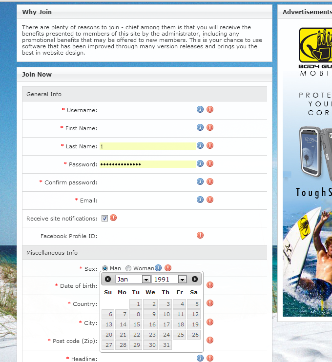 Try the following fix: This did not fix. This site was installed today; I just pulled the files from SVN and uploaded to http://www.mygaylocations.com/join.php, there have been no modifications to the site. I open the two changed files in editor and the changes are there, cache folders are all clean too. Calendar still will not work. ManOfTeal.COM a Proud UNA site, six years running strong! |