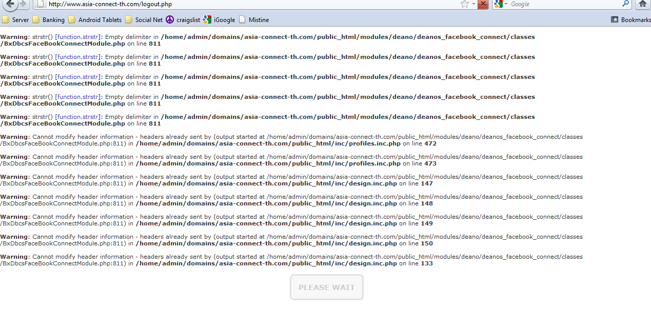 Working on that one. One other person had this problem. It's releated to the dolphin event calls. Working on a solution. In the mean time try re-uploading the file. modules\deano\deanos_facebook_connect\classes\BxFaceBookConnectAlerts.php https://www.deanbassett.com | |||||||||