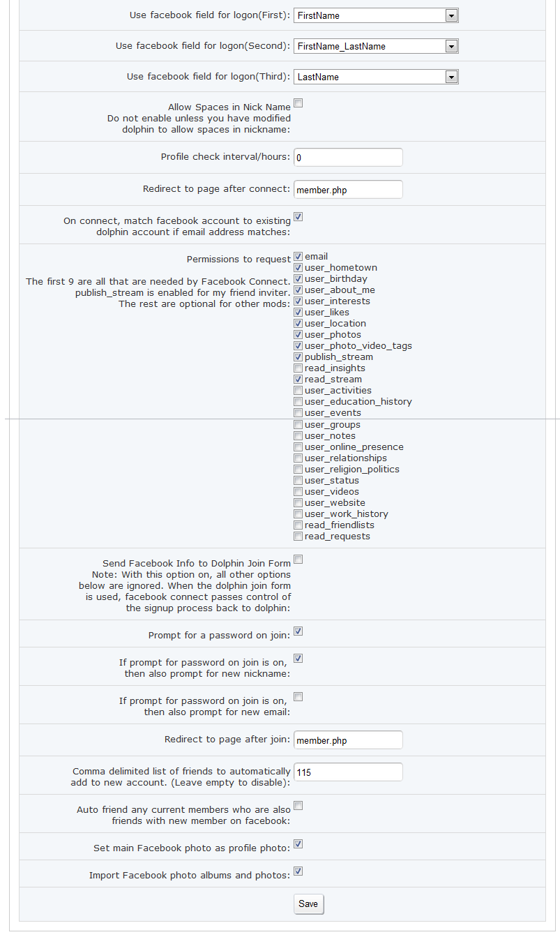 Ive tested with the pass to dolphin login form and without. With the dolphin login page selected it goes through the motions of allowing you to fill in the data and when you select join it simply sits there doing nothing at all. Testing the other option of it importing fb stuff and registering you straight onto my site, it fails to grab pics and albums from fb. it does however grab the profile pic. Due to millions of spam users daily i changed my site to fb connect only and havent had a single spam account since. My site is mainly in testing as i dont have many real users and havent done anything on it for months and months. Just decided to give it another go.lol