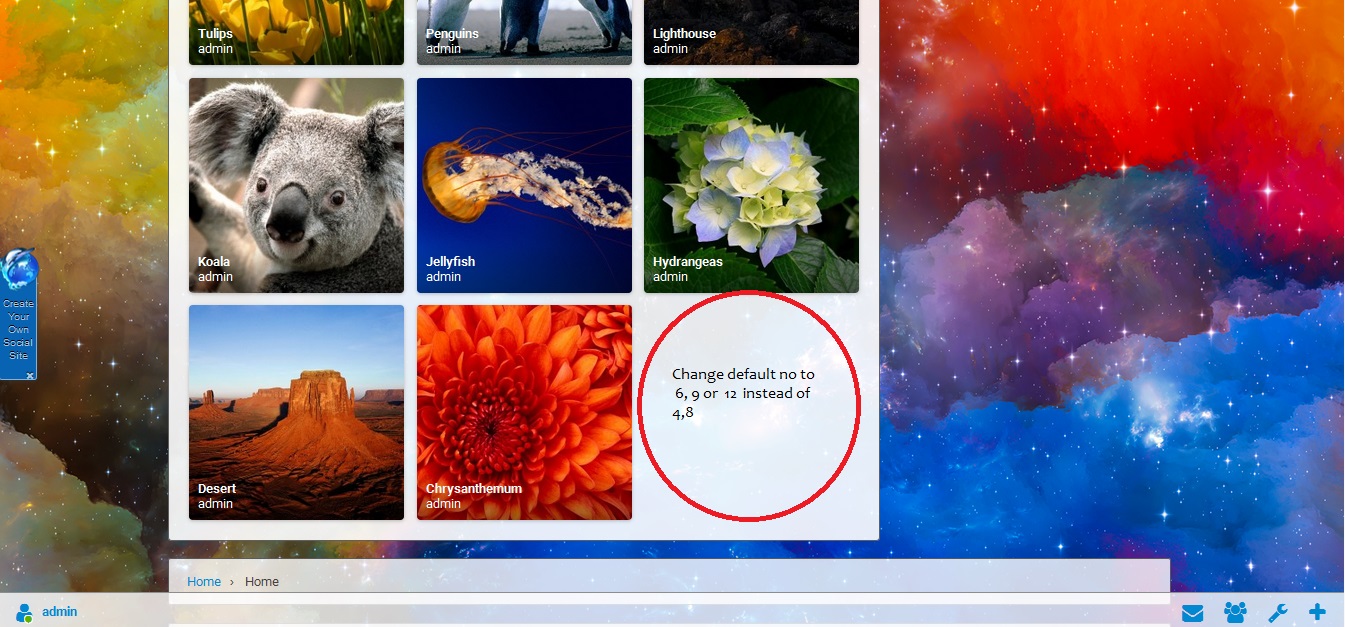 Plz change the default display numbers of images, audios and videos to 6,9 or 12 instead of 4,8 in index,home and album views. I know user can change it but still it will save them from the hassle of changing it.