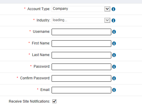 Dependent Fields will not load - see image screenshot Should load list of business industries when Account Type set to "Company" but continues to show "loading ...." message but selections will not load |