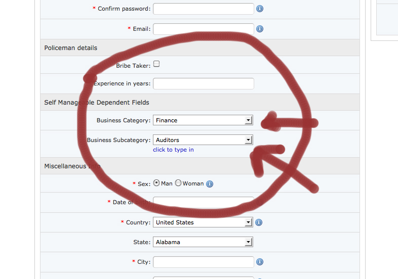 Now for any selection from the Business Category the dependent list will show only in one place "Business Subcategory". However in my case for every selection there is a separate drop-down box .... how can I make my selections all show in one spot like your in a subcategory drop-box but their values change upon selection from the top list? I hope you understand what I am trying to say.Below is what I did: