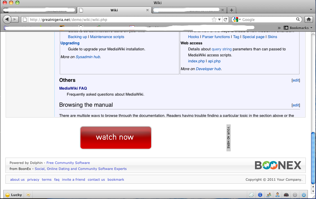 well good. i was just talking about what was on the advert. mediawiki integration. We are not selling or distributing any GNU software. What we are selling is a Dolphin Connector Module (installed in dolphin admin) and an Integration Manual that explains the several steps involved or things that you must install on your site to create a bridge between Dolphin and MediaWiki. MediaWiki is not packed in our Module. You can use an existing Mediawiki site or a new one installed from Stafflocus or fantastico in a specific subfolder inside the Dolphin directory - which we will tell you, we simply guide you through what and what tasks must be done to get a working Bridge between Dolphin and Mediawiki.
