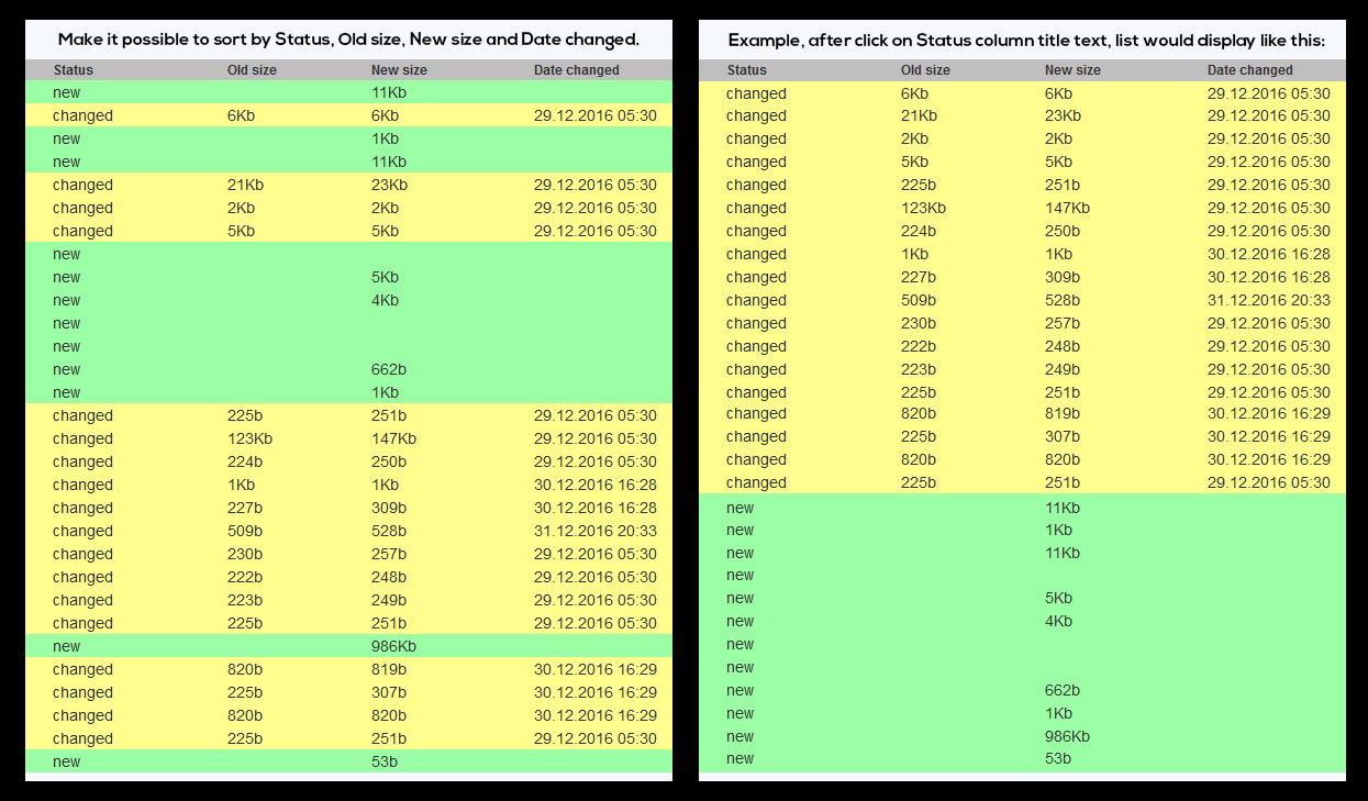 This module is awesome, but have a suggestion for next update, make it possible to sort list by Status, Old size, New size and Date changed. Maybe change the column titles to clickable text, and if clicked, the list will be sorted according to corresponding column title, and if same title is clicked again it would reverse the order by asc/desc, see attached image.