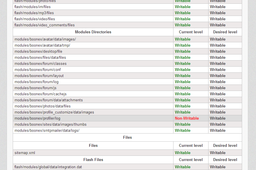 It would be a God-send if there were an additional button for all the core modules of Boonex (photos, sounds, files, forums, etc... ) which read "permissions". This would be a HUGE help to those who transfer their sites or change hosts. That way it stops the dreaded "my files will not upload" questions.