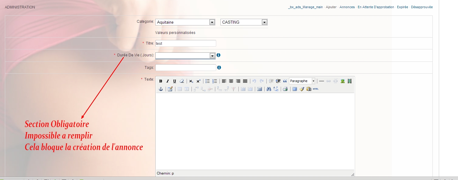 il y a une section OBLIGATOIRE dans le formulaire d'annonce