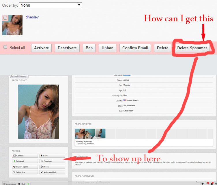 Hey guys. I have some dedicated spammers that I play cat and mouse with and I need an upper hand. They seem to know the workaround for Boonex pretty well. So far I have a few well made mods that do very well at keeping the BOTS off of my site (mainly Deanos Anti spam and added security question). I do however have a few jerks who go through the trouble of creating manual accounts but, removing them is somewhat of a chore. 1) log into cpanel 2) open spam report email 3) click on link 4) review profile 5) copy user ID 6) open dolphin admin 7) paste user id in search 8) delete spammer. How could I go about adding the delete spammer to the admin action block on the user profile so i could drop about 3-4 steps?