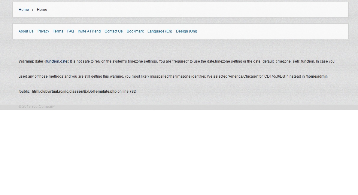 On index page ( bottom) i get this error : "Warning: date() [function.date]: It is not safe to rely on the system's timezone settings. You are *required* to use the date.timezone setting or the date_default_timezone_set() function. In case you used any of those methods and you are still getting this warning, you most likely misspelled the timezone identifier. We selected 'America/Chicago' for 'CDT/-5.0/DST' instead in /home/admin/public_html/clubvirtual.ro/inc/classes/BxDolTemplate.php on line 782