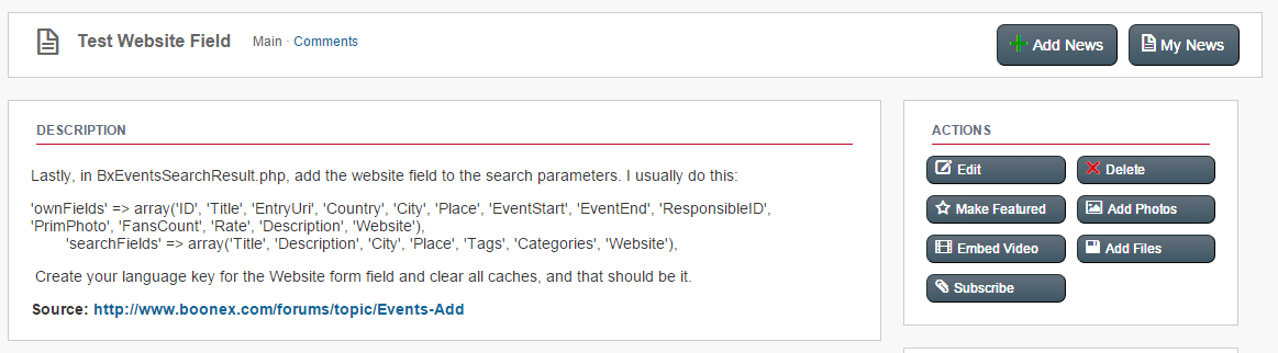 A - add a website field to the Event add form - BxEventsFormAdd.php add this: