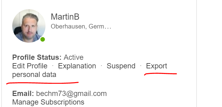 The export data button in the account page of a user. Please see attached image. |