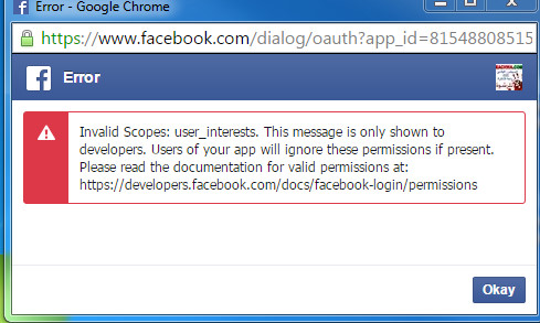 I was wondering if anyone knows or seen this error before, when I try to connect via FB connect button, I get this error: invalid Scopes: user_interests (please see attached). I have no idea whether this needs to be fixed at the FB App level or D7 level or maybe the FB connect button is not working properly..