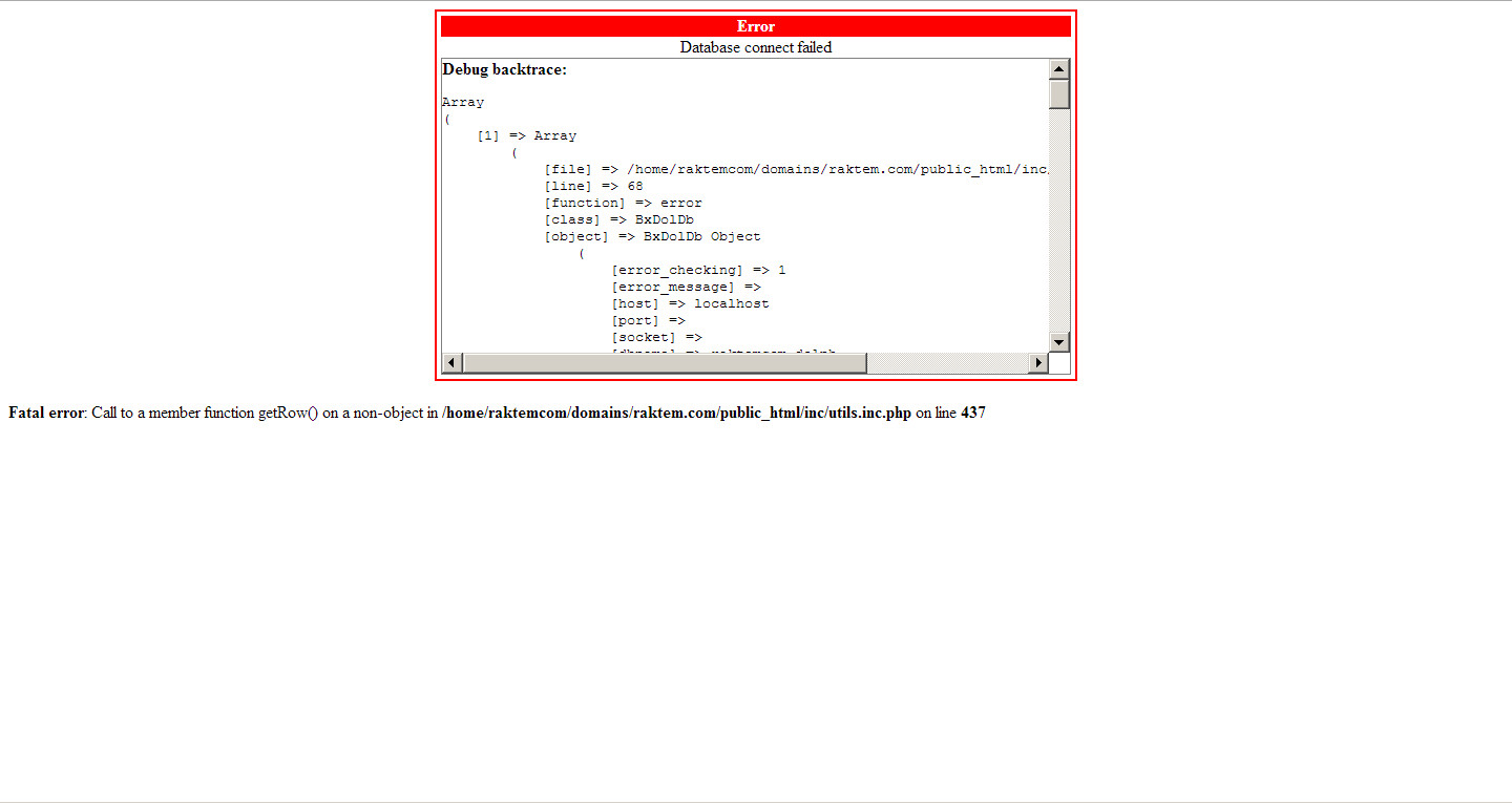 Fatal error: Call to a member function getRow() on a non-object in /home/raktemcom/domains/raktem.com/public_html/inc/utils.inc.php on line 437
